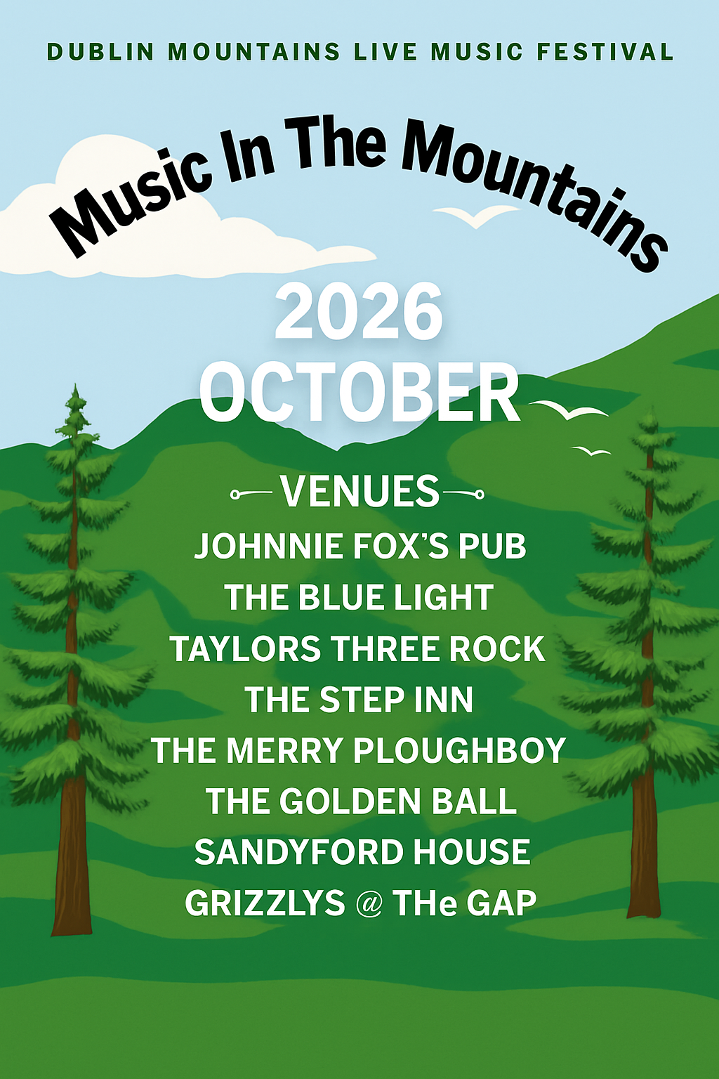 We’re back for another unforgettable weekend of live music, culture, and community across some of Dublin’s most iconic mountain venues — from Johnnie Fox’s to The Blue Light, Taylors Three Rock, The Merry Ploughboy, Sandyford House, The Step Inn, The Golden Ball & Grizzlys Glencullen